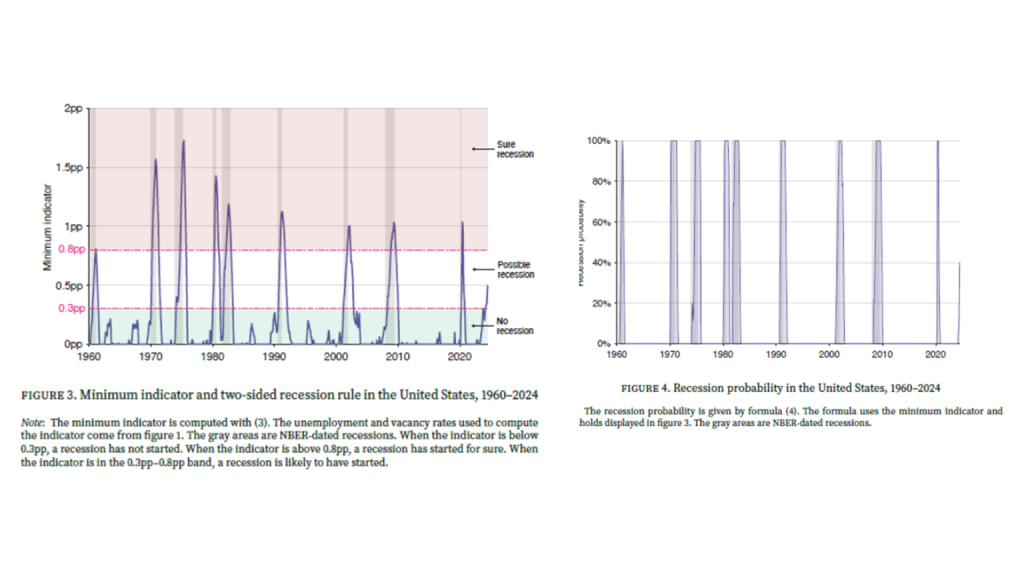 which is the minimum of the Sahm indicator; and the difference between the 3-month trailing average of the vacancy rate and its maximum over the previous 12 months, which is an indicator constructed similarly with the vacancy rate. We then suggest a recession rule with two sides: